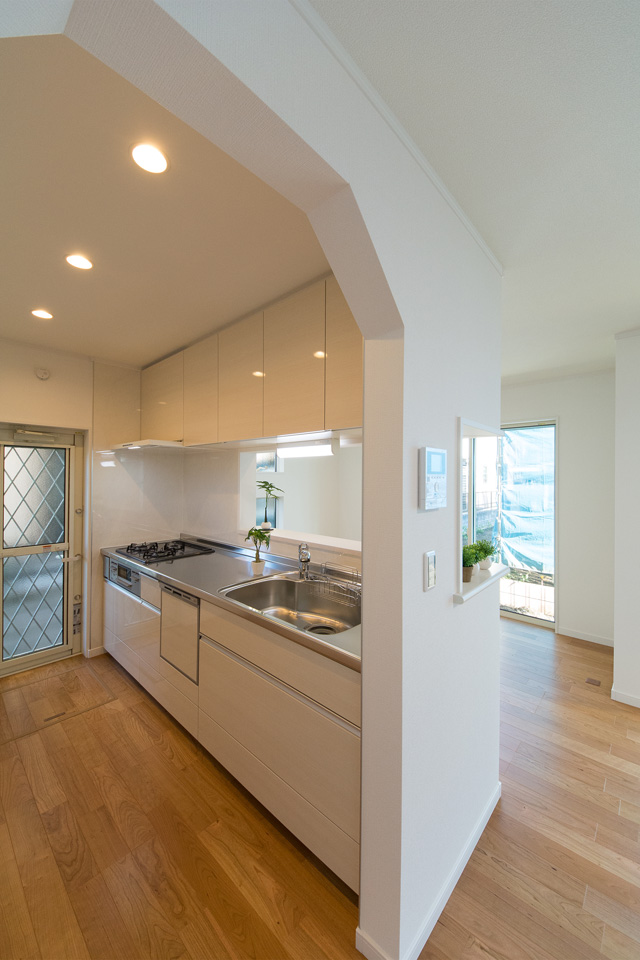 白を基調とした清潔感のあるキッチンスペース。R形状にした入口がやさしい印象を与えます。