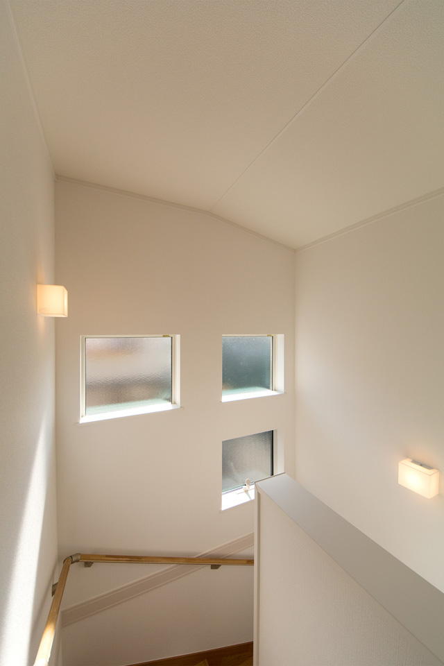 縦スリットから自然の光が差し込む、明るく開放感のある玄関。