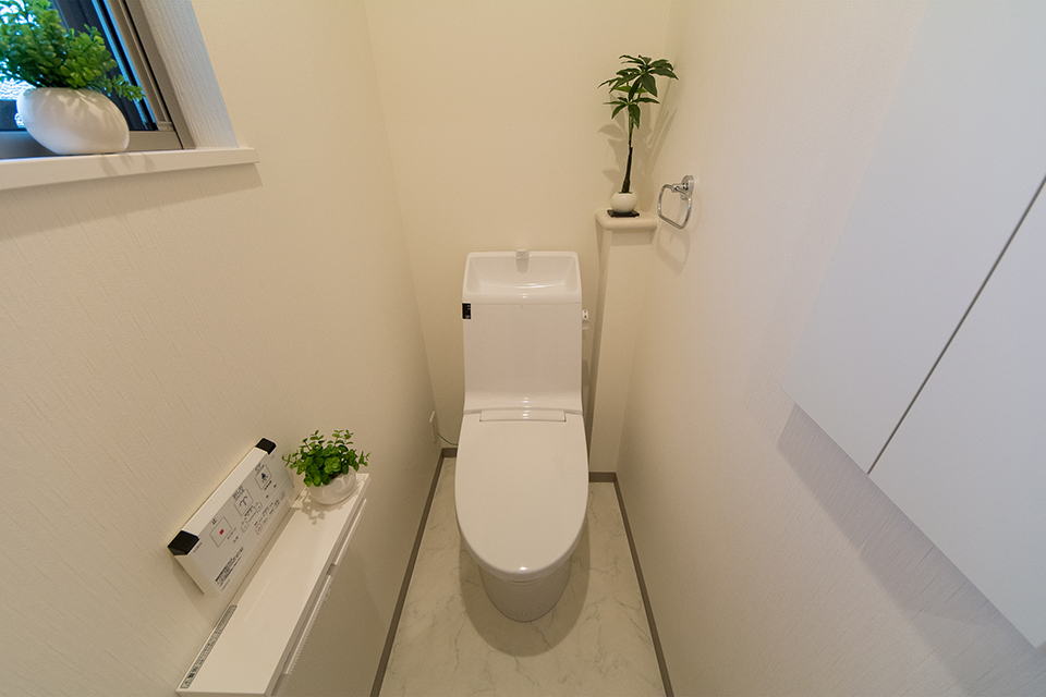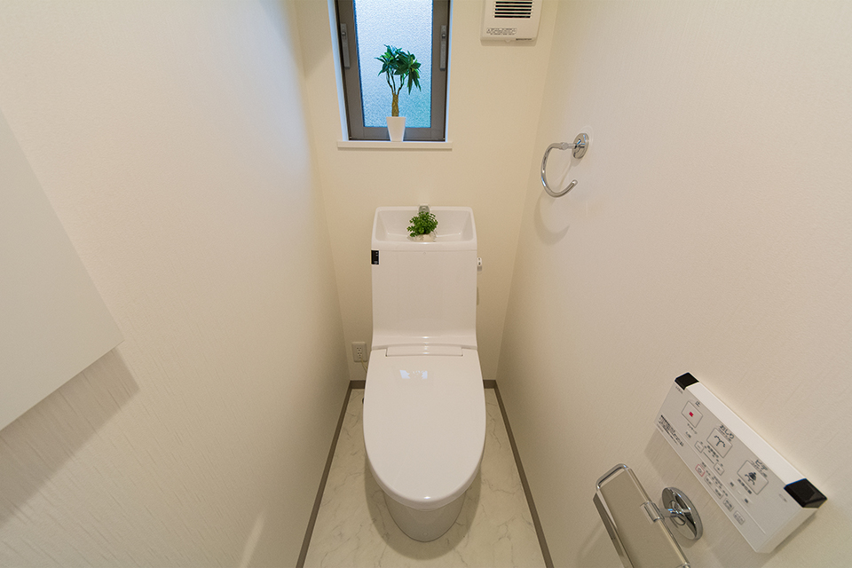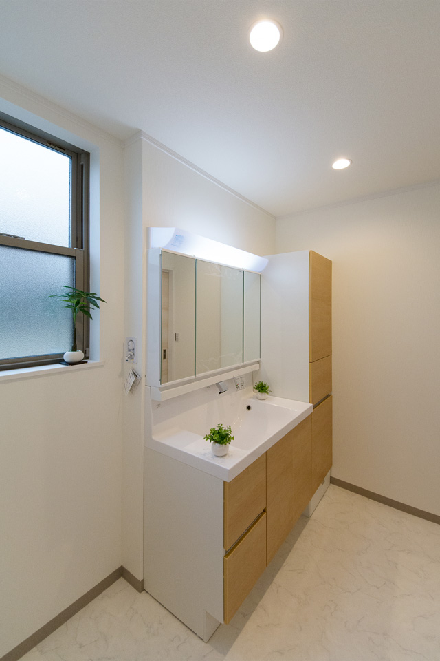 白を基調とした清潔感のあるサニタリールーム。ブラウンの洗面化粧台がナチュラルな雰囲気の空間を演出します。