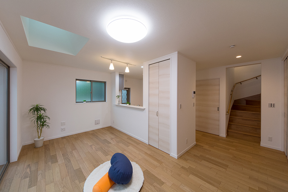 勾配天井にトップライトを設えたリビング。明るく開放感のある空間に。