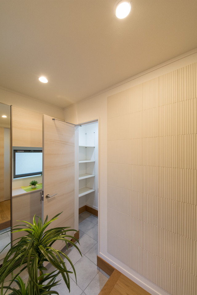 ベビーカーや傘立てなどが収納できる便利な土間収納を設えた玄関。