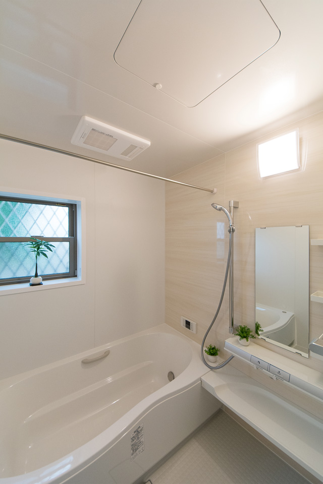 自然な配色のアクセントパネルを使用したバスルーム。心地良い穏やかな空間に。