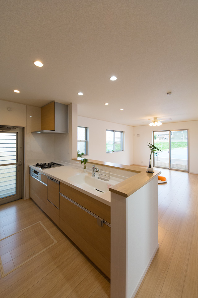 白を基調とした清潔感あるキッチン。ブラウンのキッチン扉がナチュラルな雰囲気を演出。