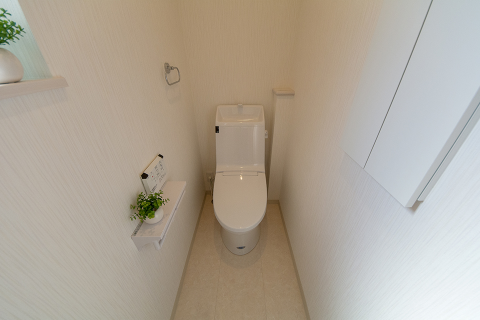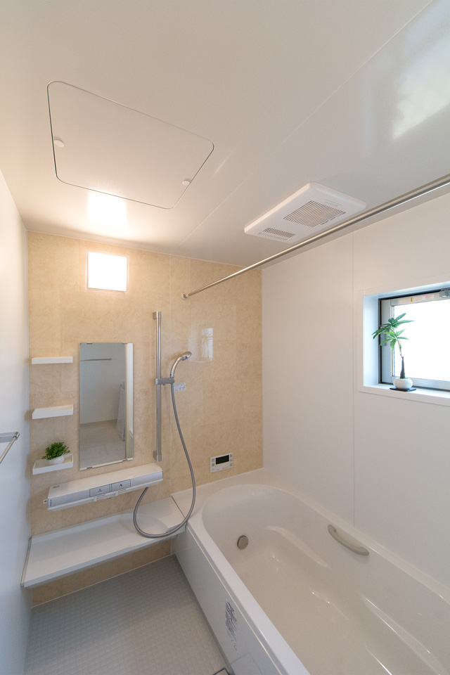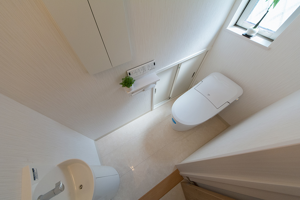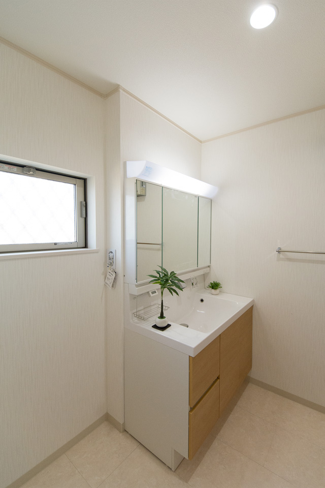 白を基調とした清潔感のあるサニタリールーム。ブラウンの洗面化粧台がナチュラルな雰囲気の空間を演出します。