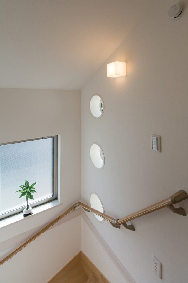 丸型のFIX窓が印象的な明るく開放感のある階段スペース。