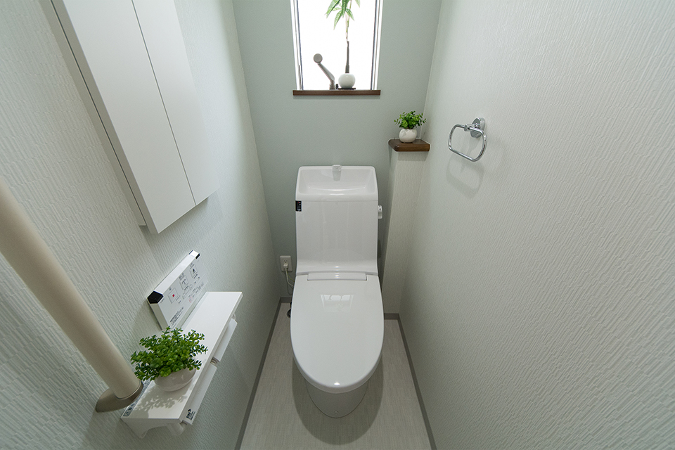 白を基調とした清潔感のある1階トイレ。ミントグリーンのアクセントクロスが爽やかな印象を。