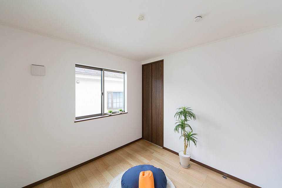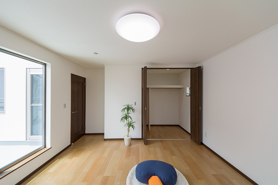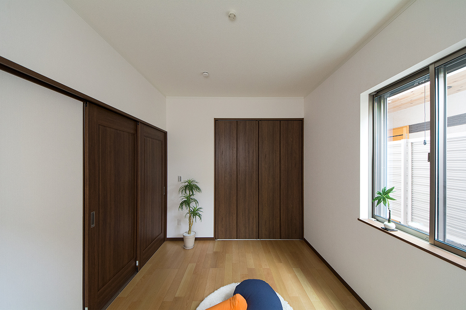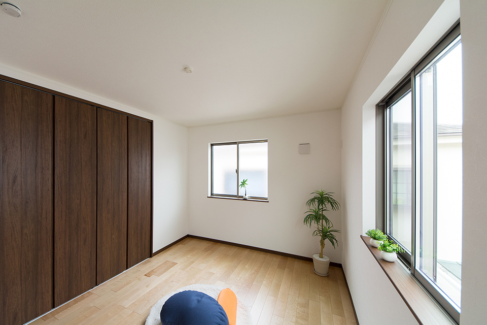 2階洋室。バーチのフローリングとウォルナットの建具が、リビング同様ナチュラルな空間を演出。