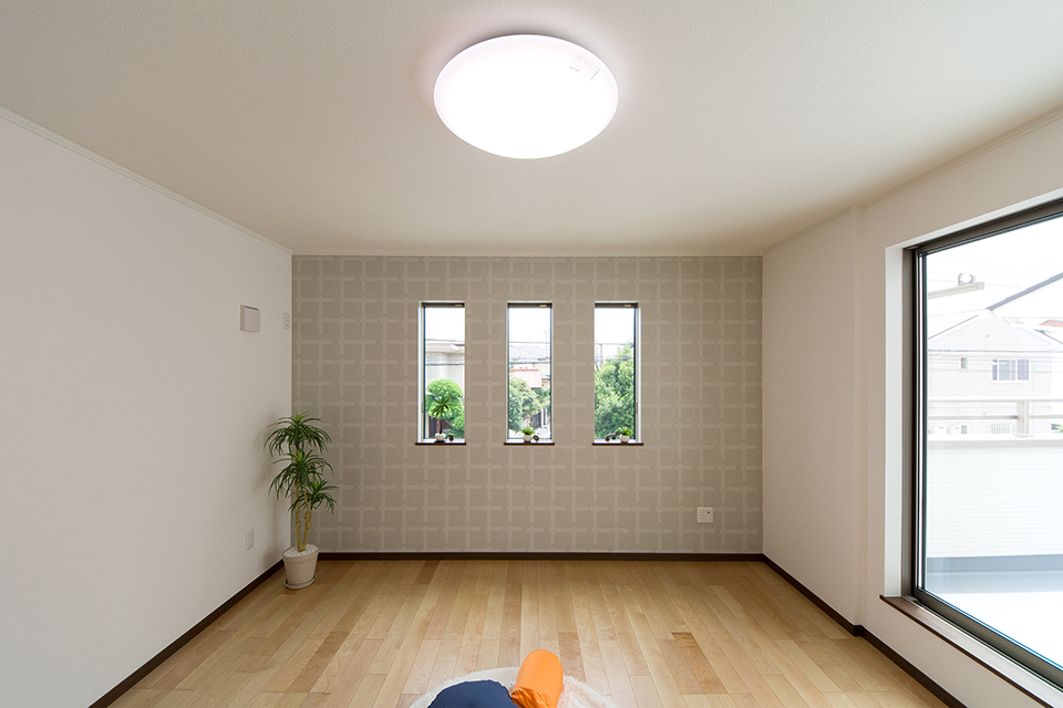 端正な表情を見せる3連の縦すべり窓。アクセントクロスが爽やかな印象をプラス。