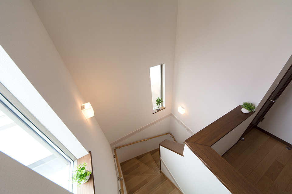 大きな窓をしつらえた、明るく開放感のある階段。