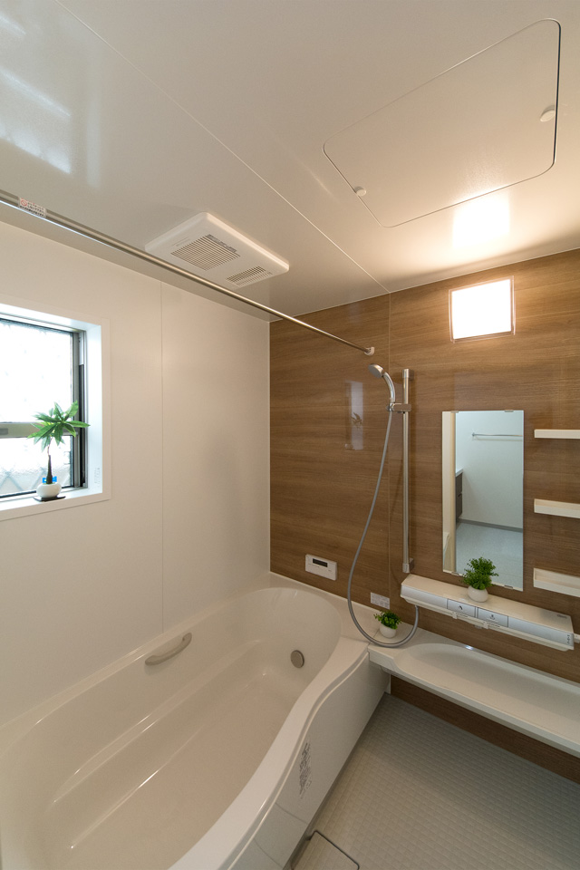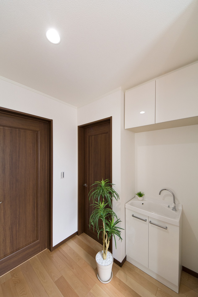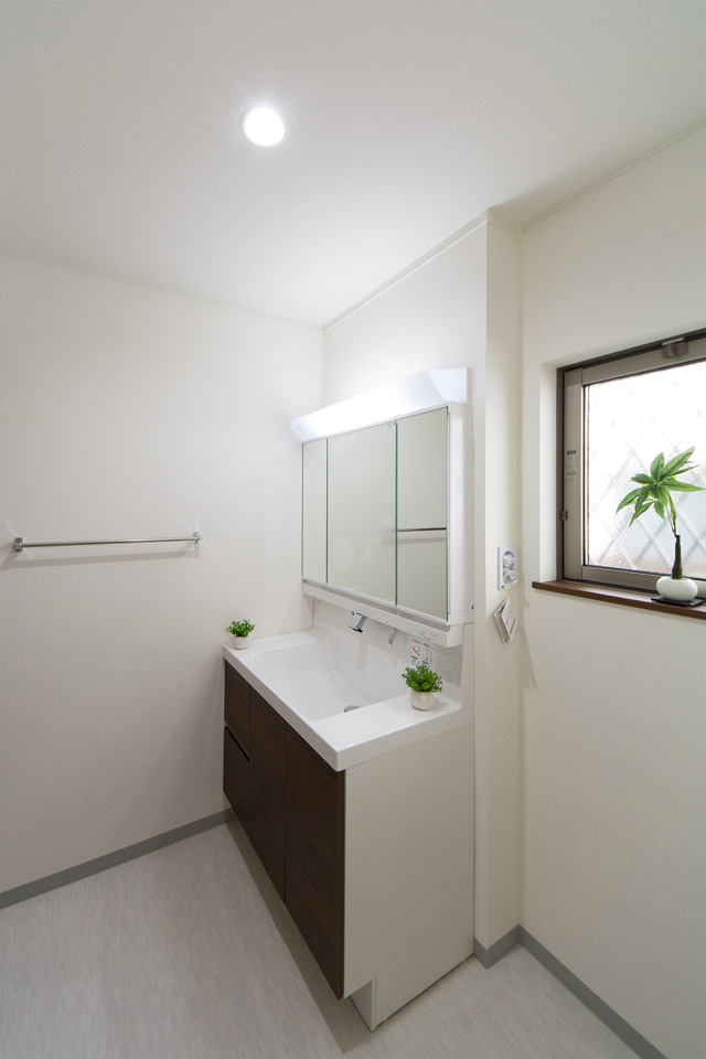 白を基調とした清潔感のあるサニタリールーム。ダークブラウンの洗面化粧台がナチュラルな印象を与えます。