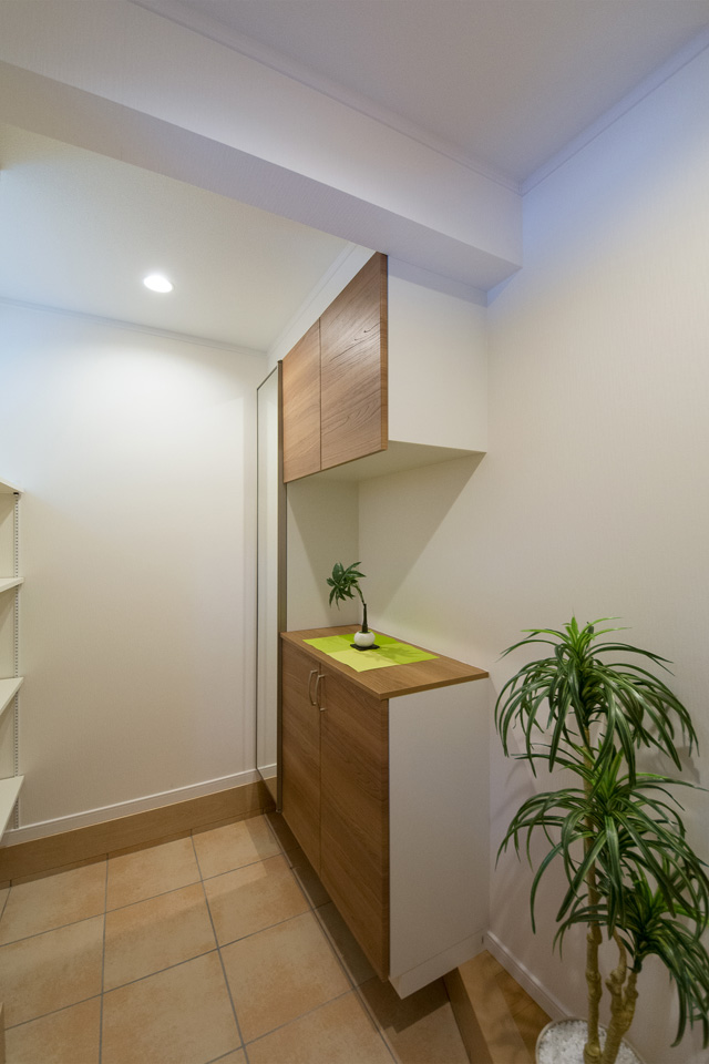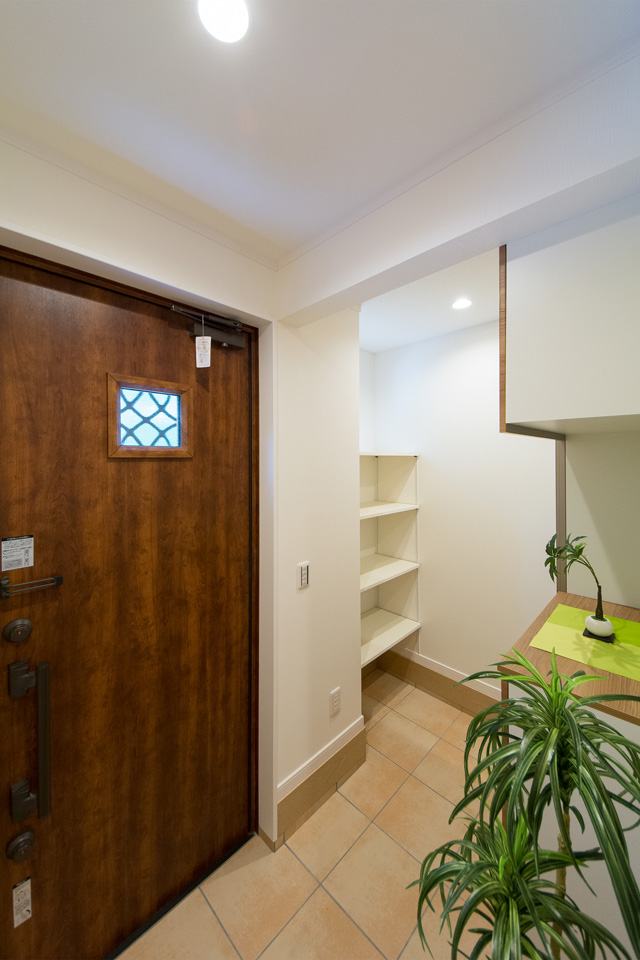 ベビーカーや傘立てなどが収納できる便利な土間収納を設えた玄関。