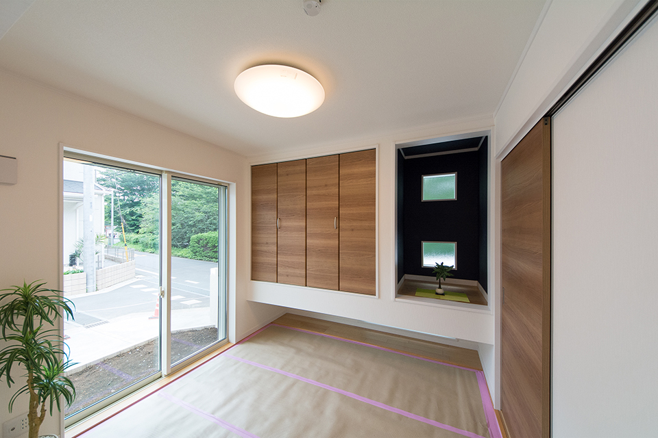 1階畳敷き洋室(写真は畳設置前)。紺色のアクセントクロスが空間を引き締め、モダンな雰囲気を演出。