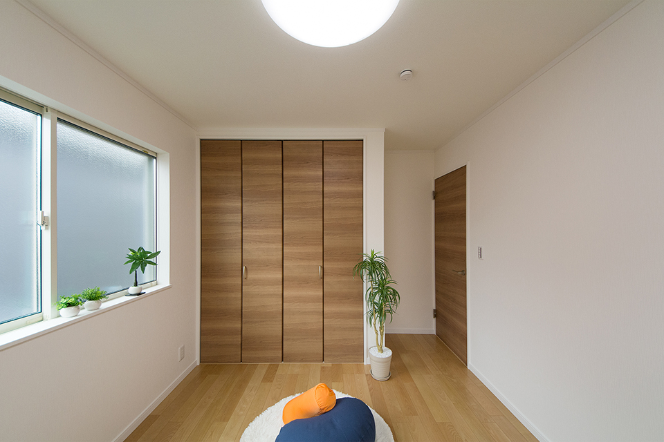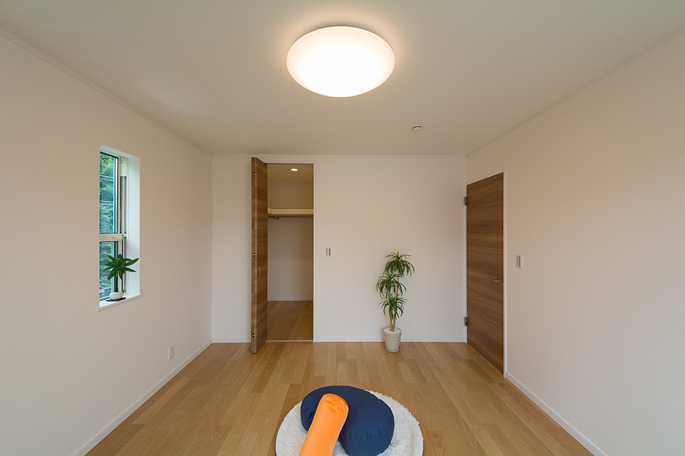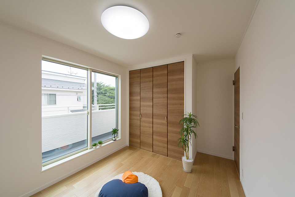 2階洋室。バーチのフローリングとブラウンの建具がナチュラルな空間を演出。