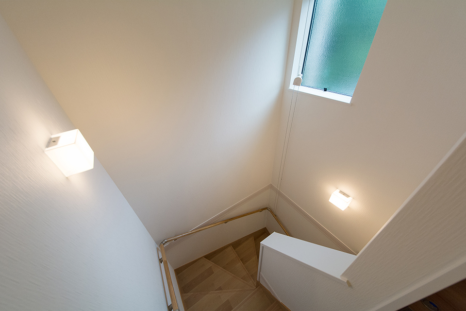 大きな窓をしつらえた、明るく開放感のある階段。