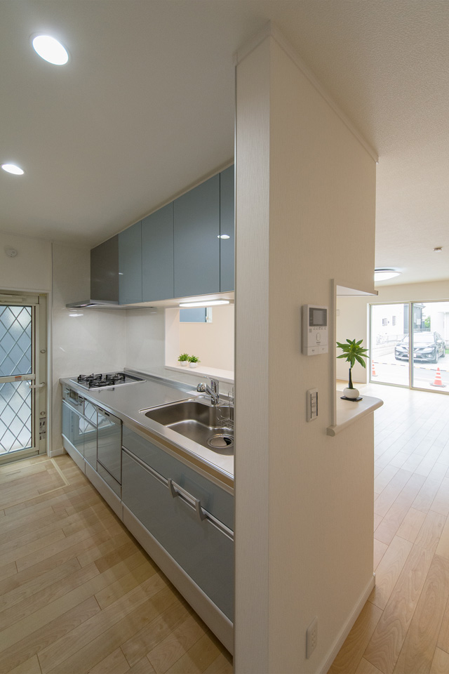 グレイッシュな水色で爽やかな印象のキッチン。