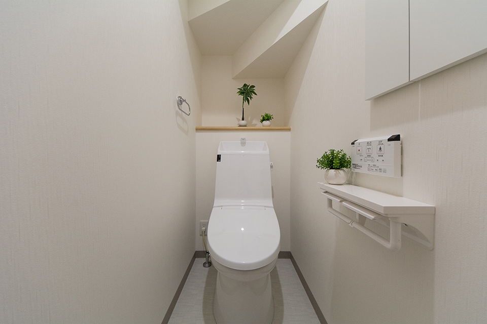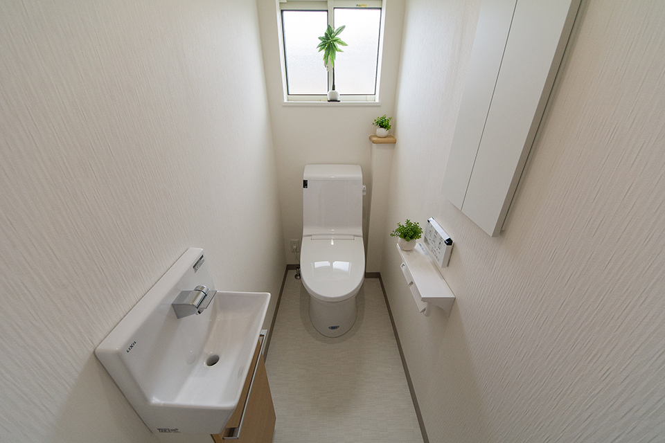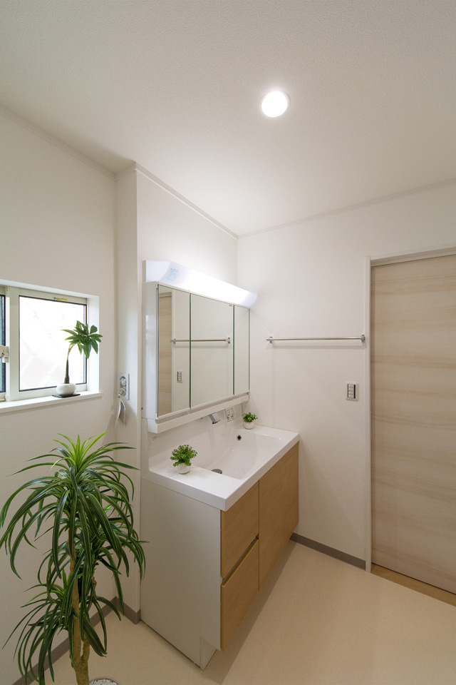 白を基調とした清潔感のあるサニタリールーム。ブラウンの洗面化粧台がナチュラルな印象を与えます。