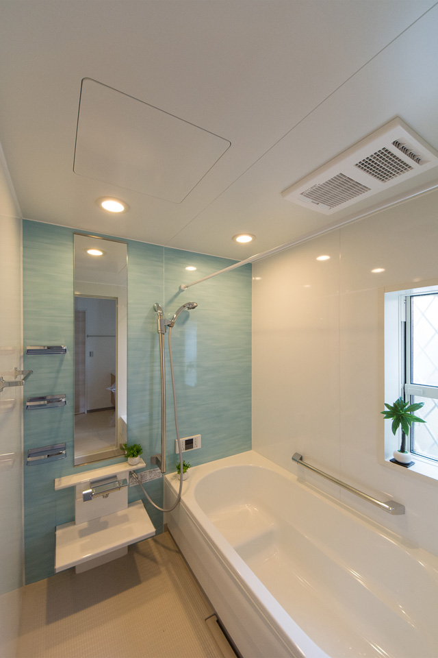 オーシャンブルーのアクセントパネルが爽やかな空間を演出するバスルーム。
