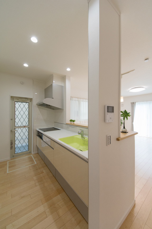 白を基調とした清潔感のあるキッチンスペース。ライムグリーンのシンクが爽やかな印象をプラス。