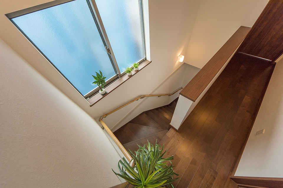 大きな窓をしつらえた、明るく開放感のある階段。