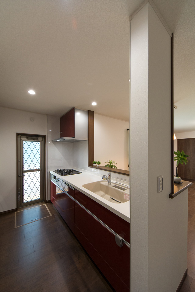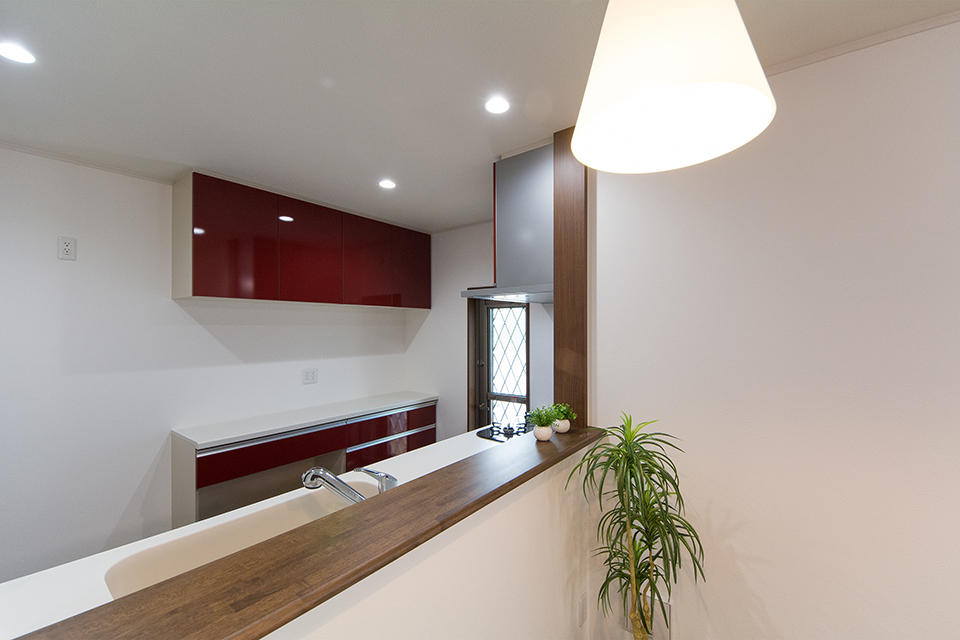 白を基調とした清潔感あるキッチン。ディープレッドのキッチン扉がエレガントな雰囲気を演出。