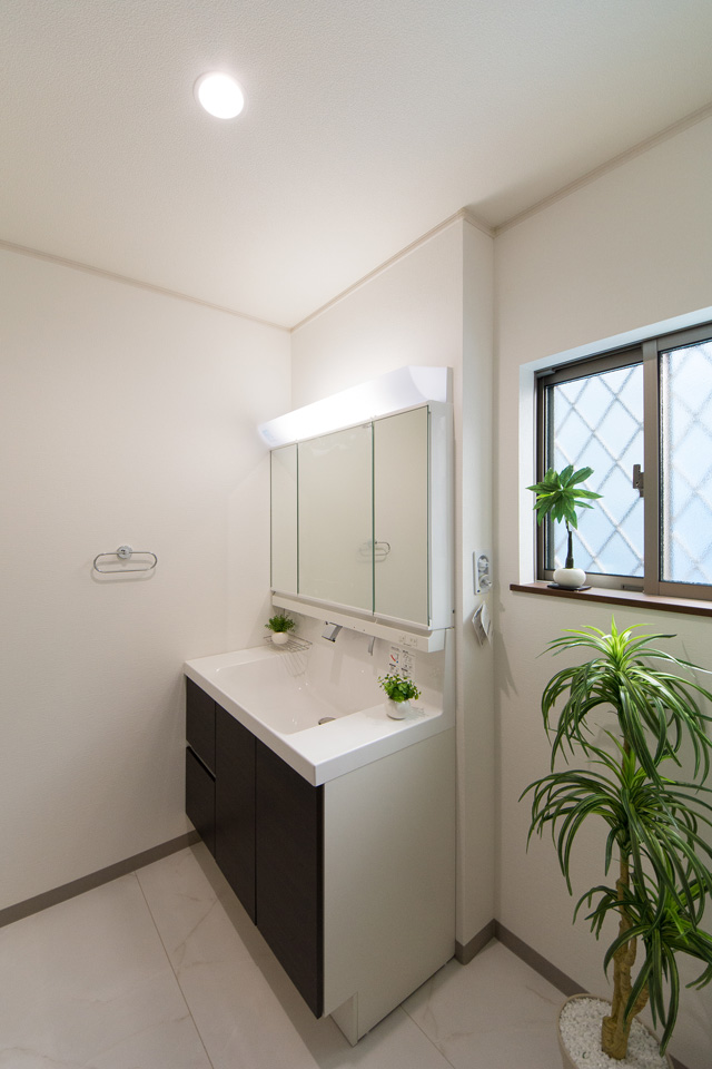 白を基調とした清潔感のあるサニタリールーム。ダークのブラウンの洗面化粧台が印象的。