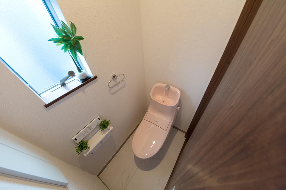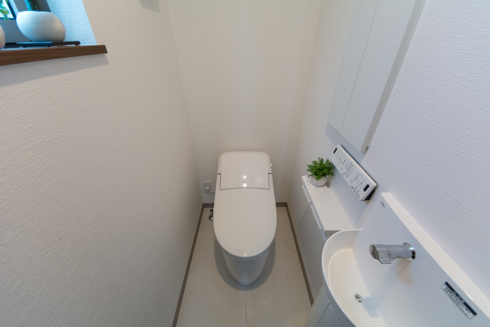 白を基調とした清潔感のある2階トイレ。