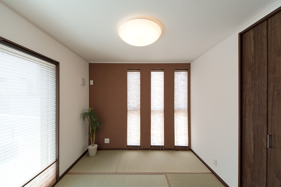 小豆色のアクセントクロスが空間を彩る畳敷き洋室。
