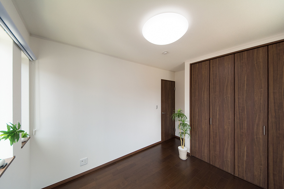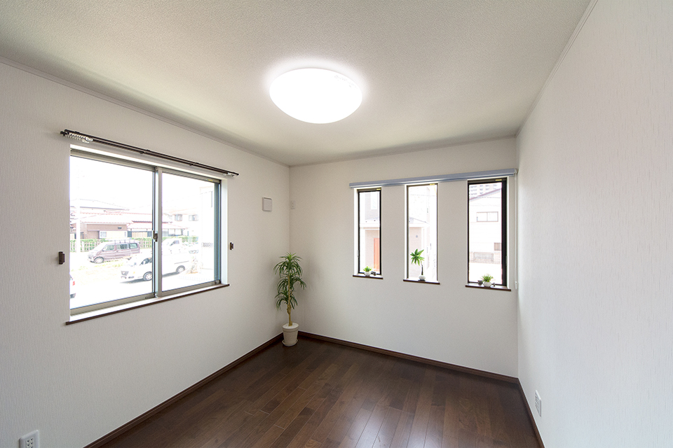 2階洋室。ブラックウォルナットのフローリングと白いクロスがメリハリのある空間を演出。