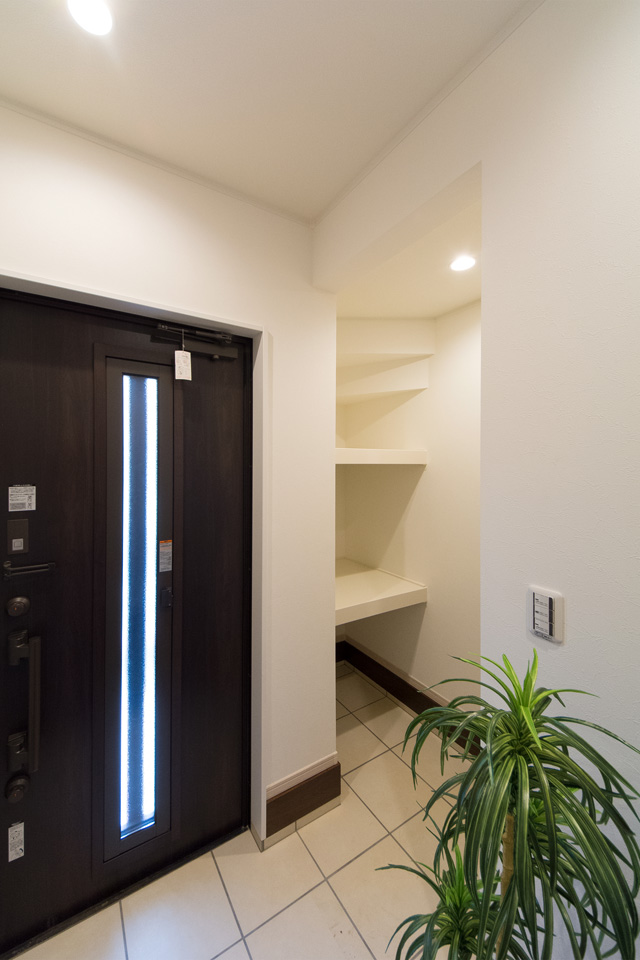 縦スリットから自然の光が差し込み明るく開放感のある玄関。