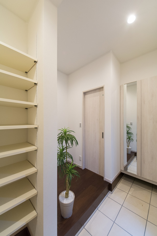 ベビーカーや傘立てなどが収納できる便利な土間収納を設えた玄関。