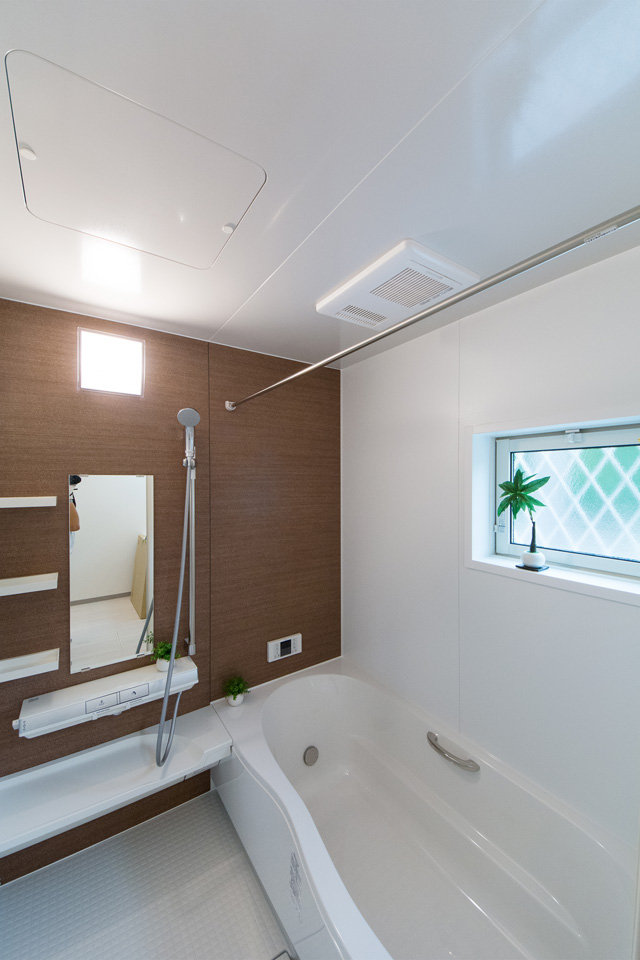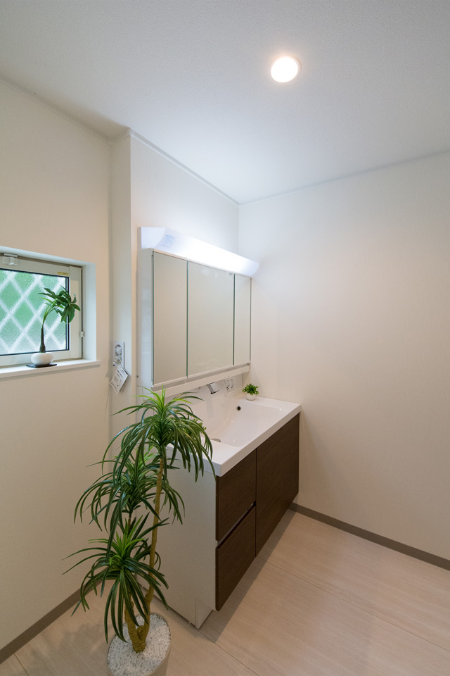 白を基調とした清潔感のあるサニタリールーム。モカ色の洗面化粧台がナチュラルな印象を与えます。