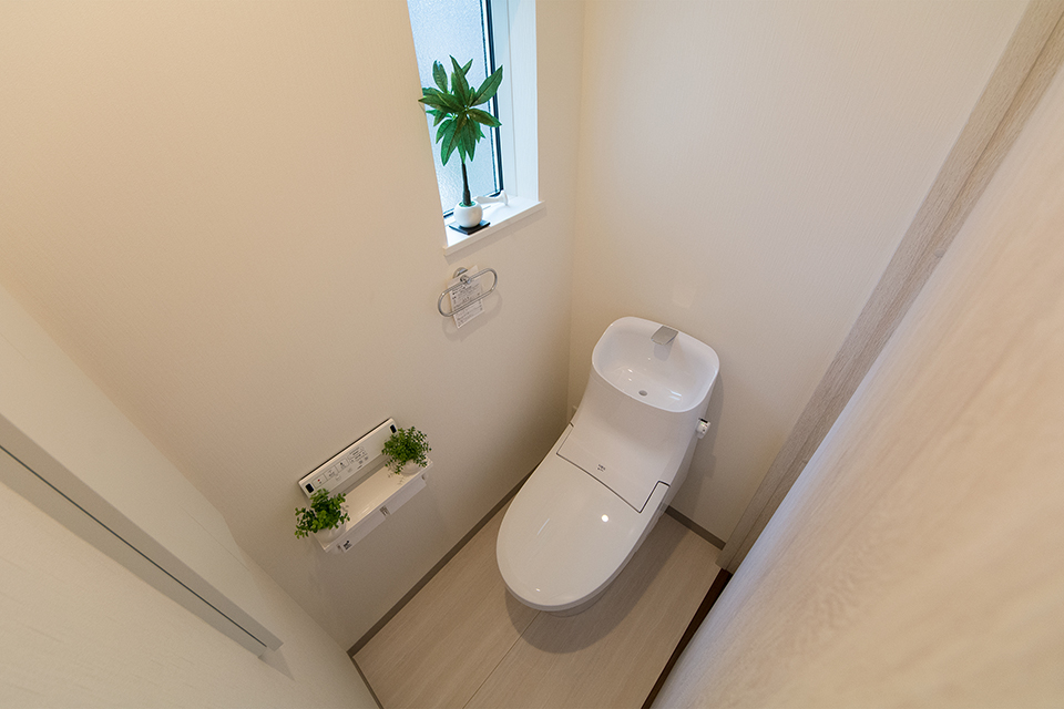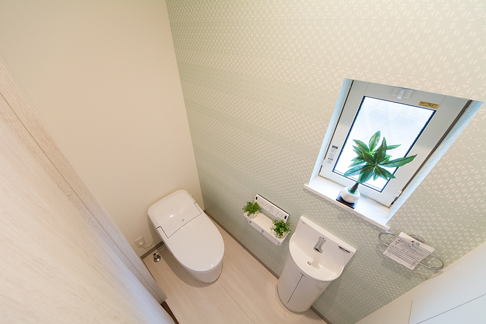 白を基調とした清潔感のある1階トイレ。ライトグリーンのアクセントクロスが爽やかな印象をプラス。