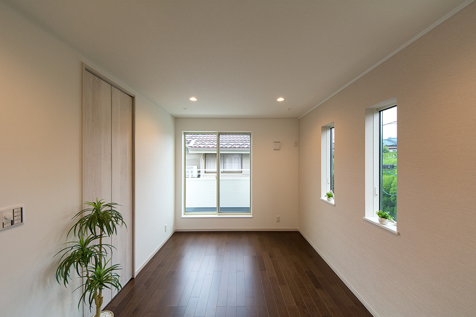 2階洋室もリビング同様の配色。ブラックウォルナットのフローリングに白のクロスと建具がメリハリのある空間を演出。