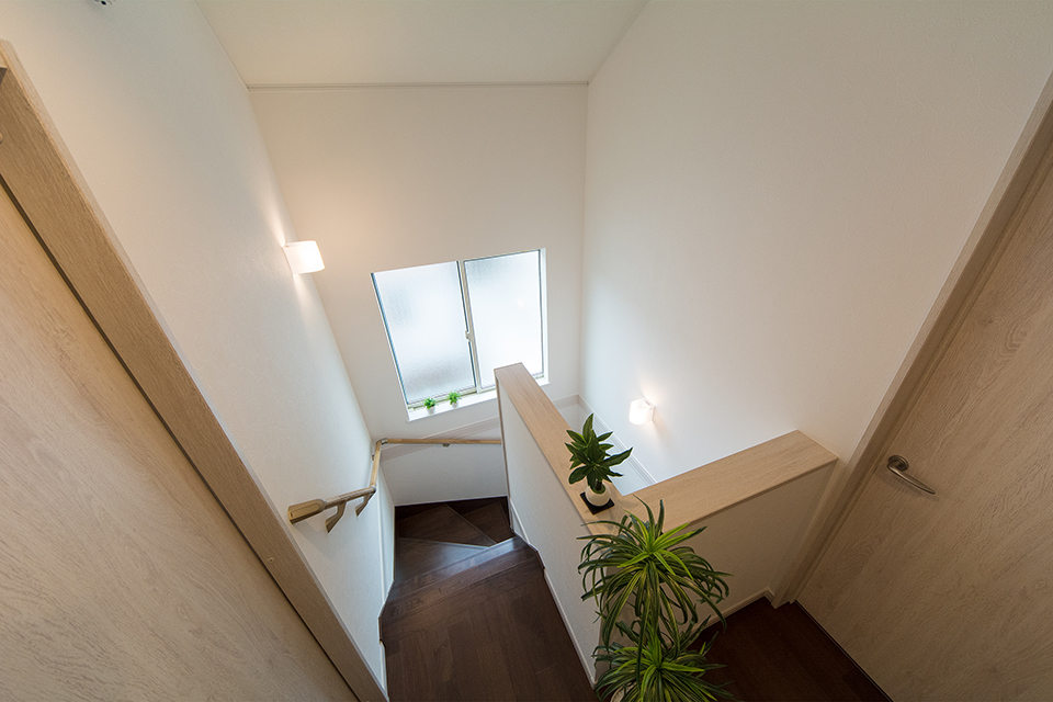 大きな窓をしつらえた、明るく開放感のある階段。
