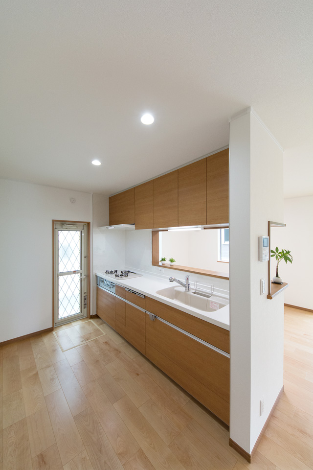 白を基調とした清潔感のあるキッチンスペース。ブラウンのキッチンパネルがナチュラルな雰囲気を演出。