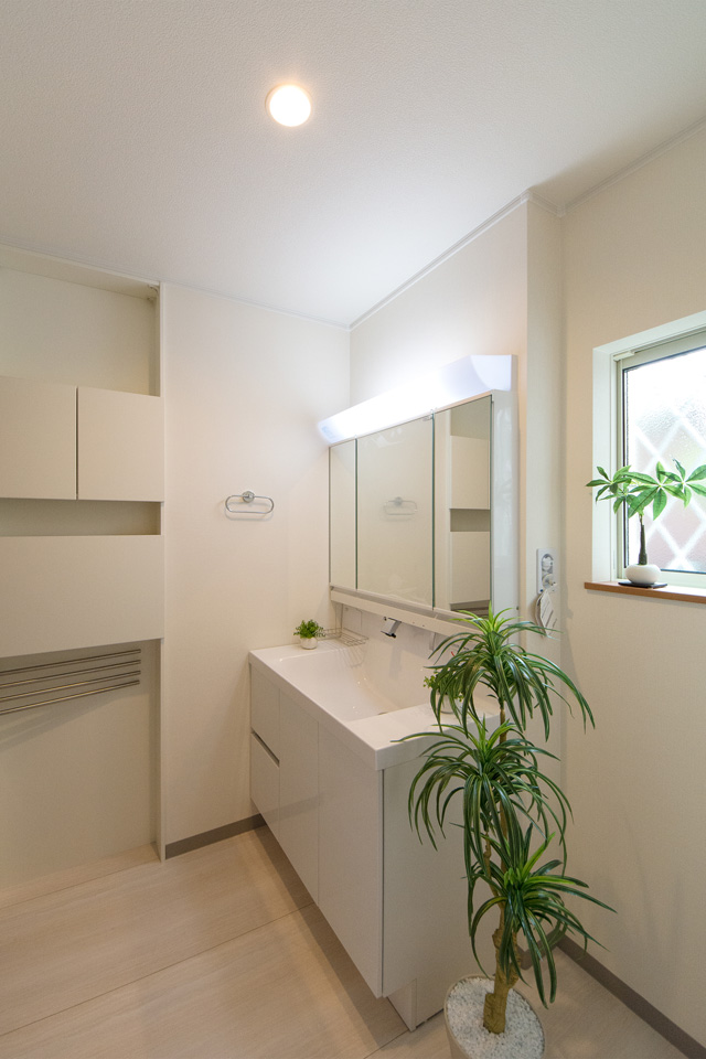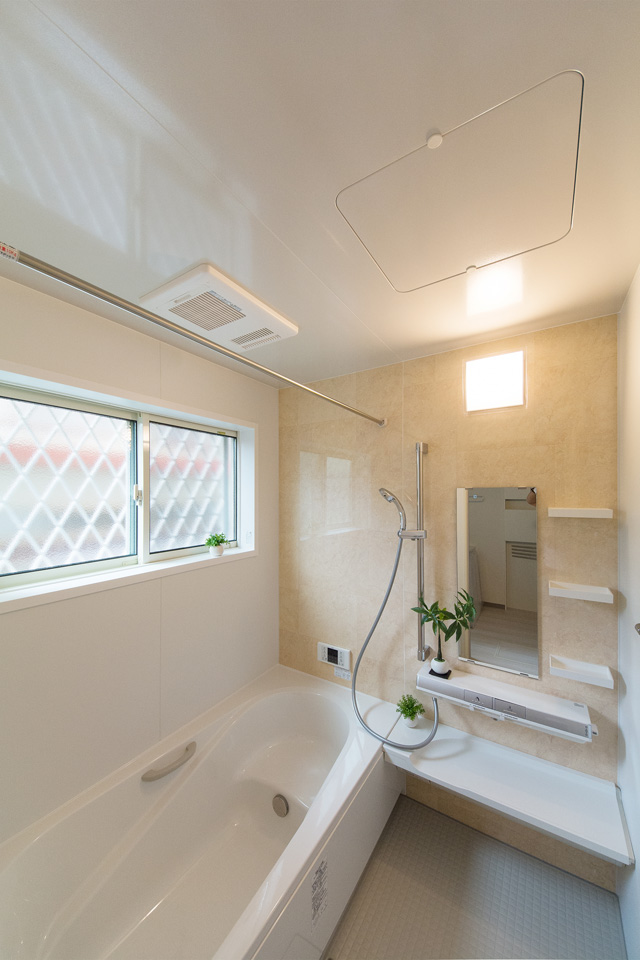 自然な配色のアクセントパネルを使用したバスルーム。心地良い穏やかな空間に。