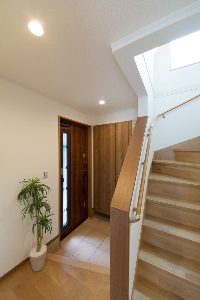 縦スリットから自然の光が差し込み明るく開放感のある玄関。