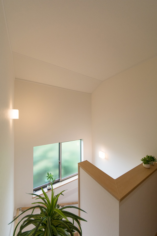 大きな窓をしつらえた、明るく開放感のある階段。