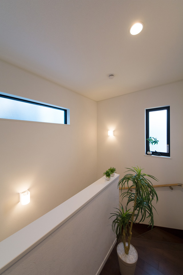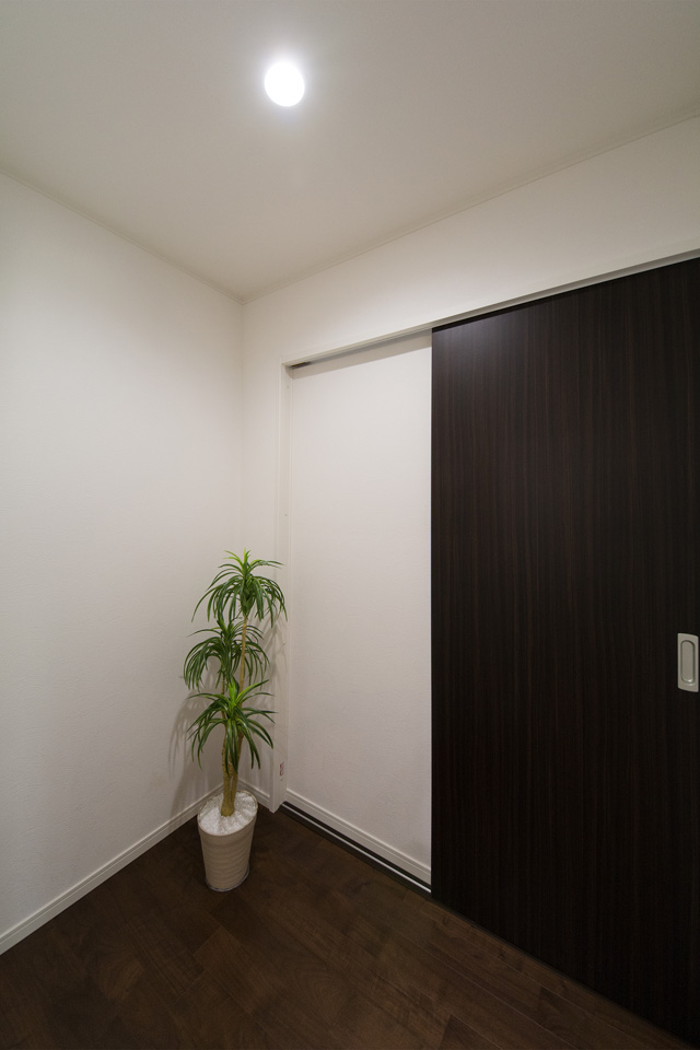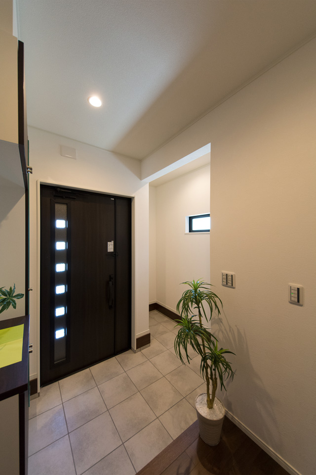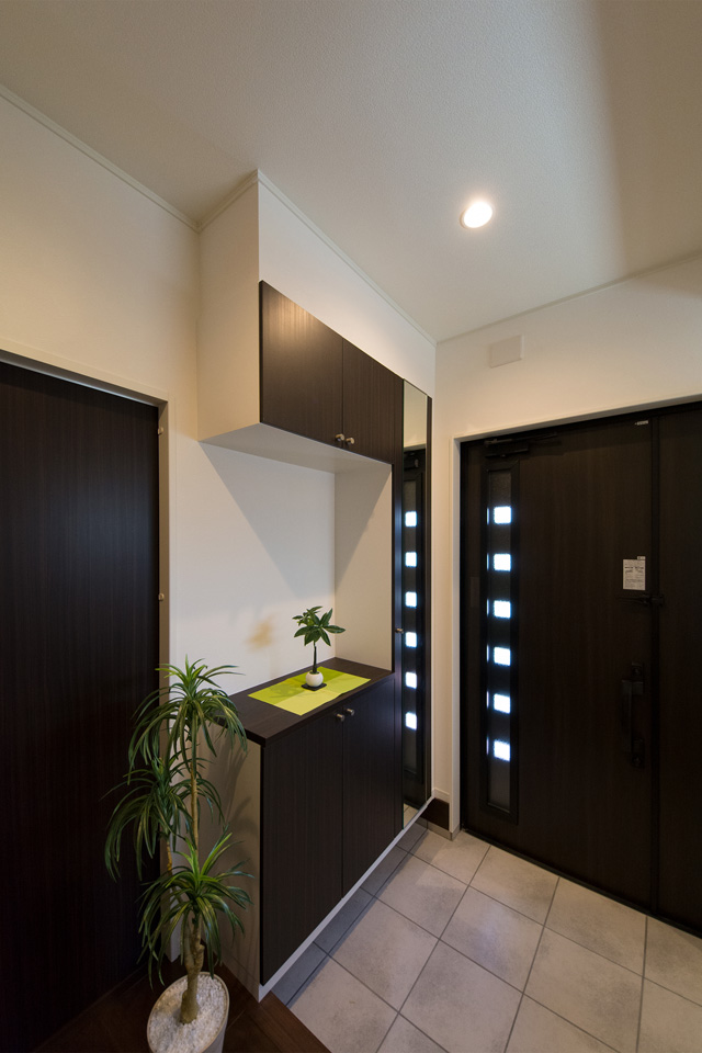 櫛引調のテクスチャーが印象的な白のサイディングに黒の木目調サイディングを合わせたスタイリッシュな外観デザイン。 エントランスのスリット格子がシャープな印象をプラス。