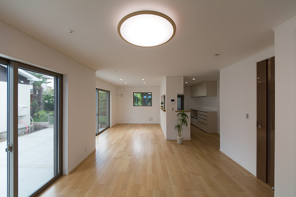 穏やかな木目と緻密な木肌が印象的なバーチのフローリングがブラウンの建具と相まって、ナチュラルな空間を演出。