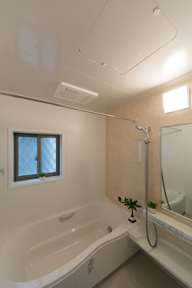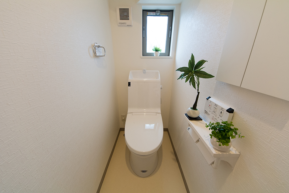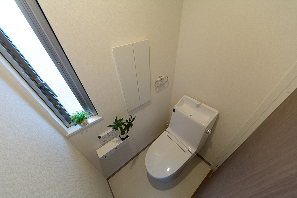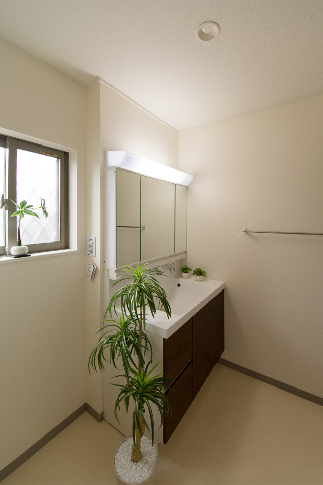 白を基調とした清潔感のあるサニタリールーム。ブラウンの洗面化粧台がナチュラルな印象を与えます。