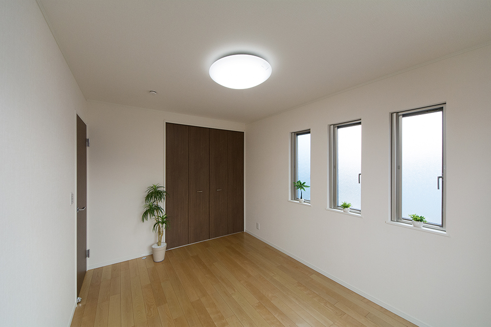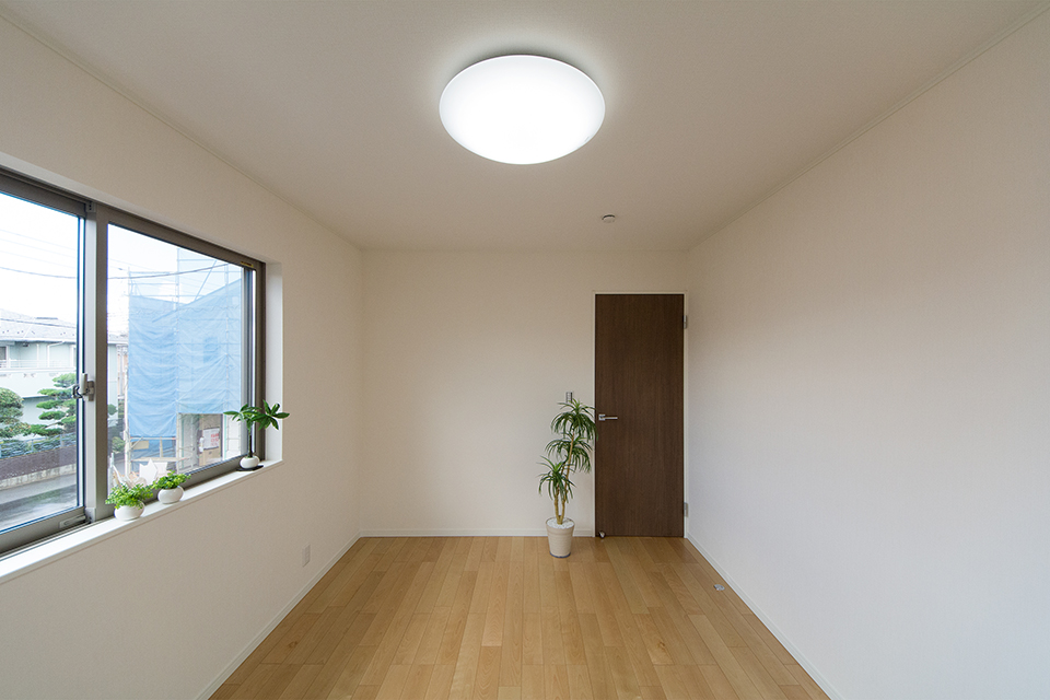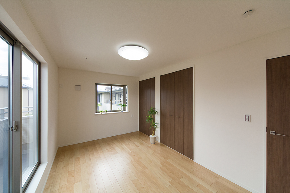 2階洋室。バーチのフローリングとブラウンの建具がナチュラルな空間を演出。