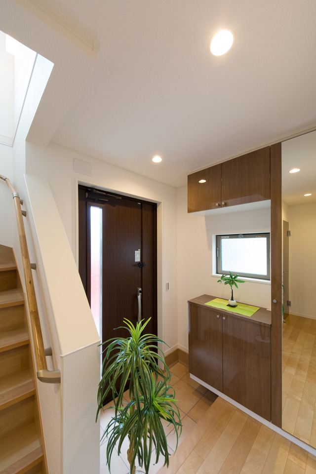 縦スリットから自然の光が差し込み明るく開放感のある玄関。