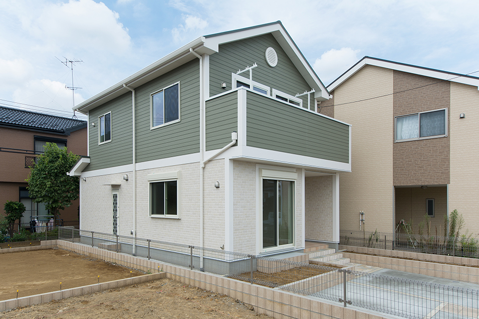 グリーンの外壁に白い妻飾りが映え、ナチュラルな雰囲気を演出。