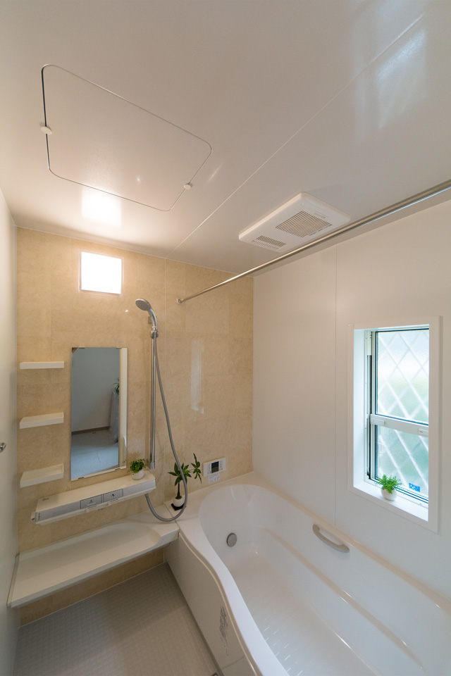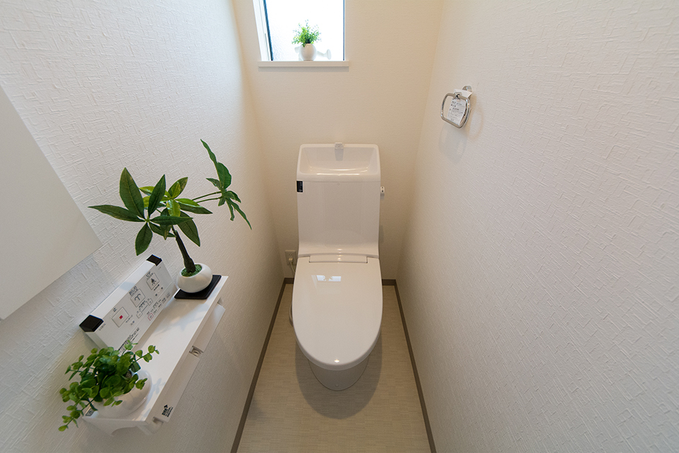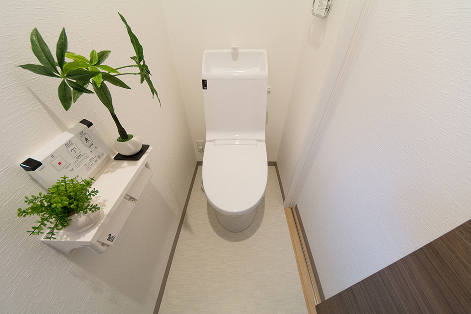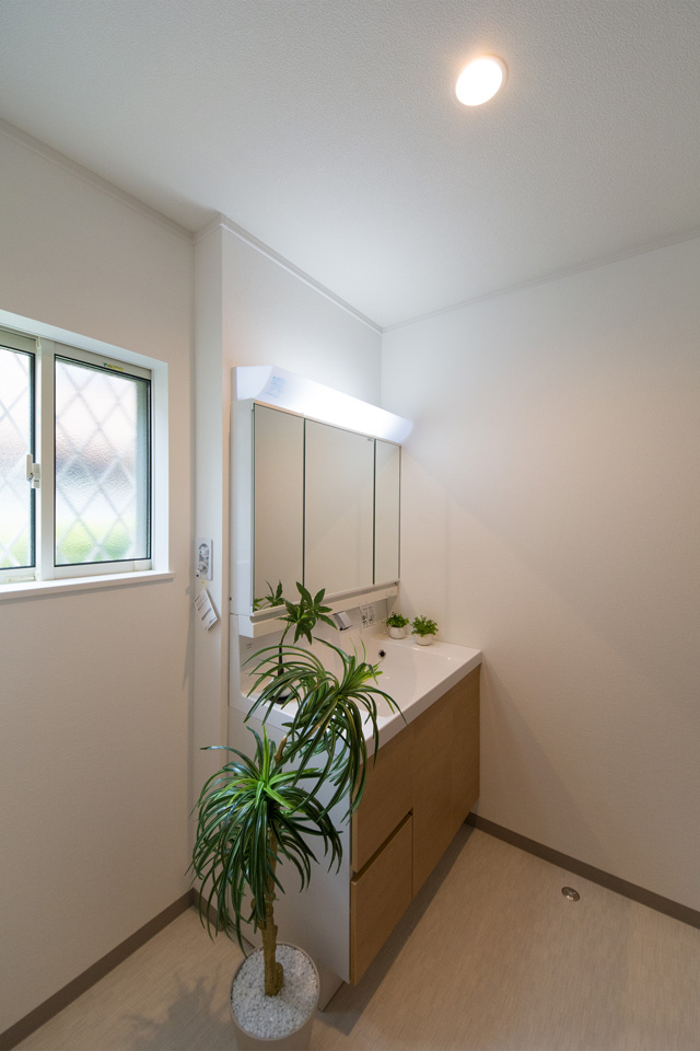 白を基調とした清潔感のあるサニタリールーム。ブラウンの洗面化粧台がナチュラルな印象を与えます。