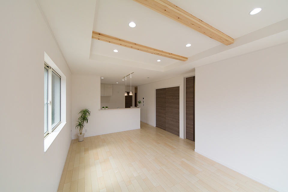木のぬくもりを感じるシカモアのフローリング。天井の化粧梁と相まってナチュラルな空間を演出。