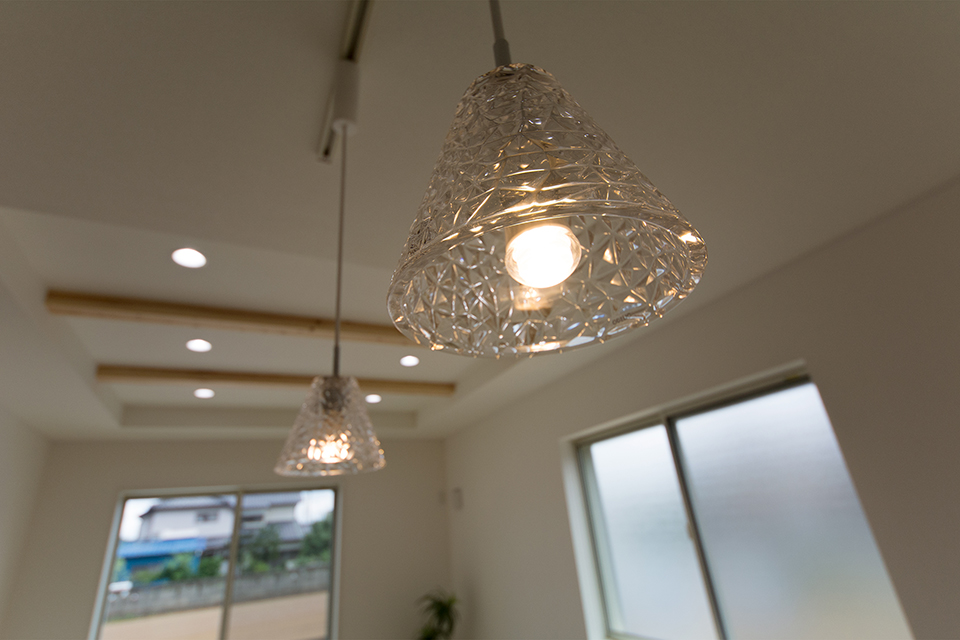 繊細なカッティングが美しいガラスシェードのペンダントライト。
