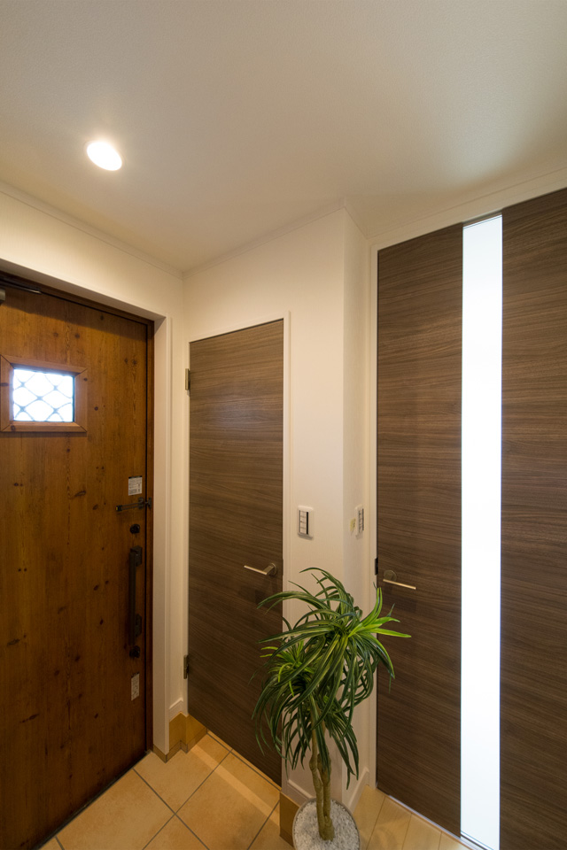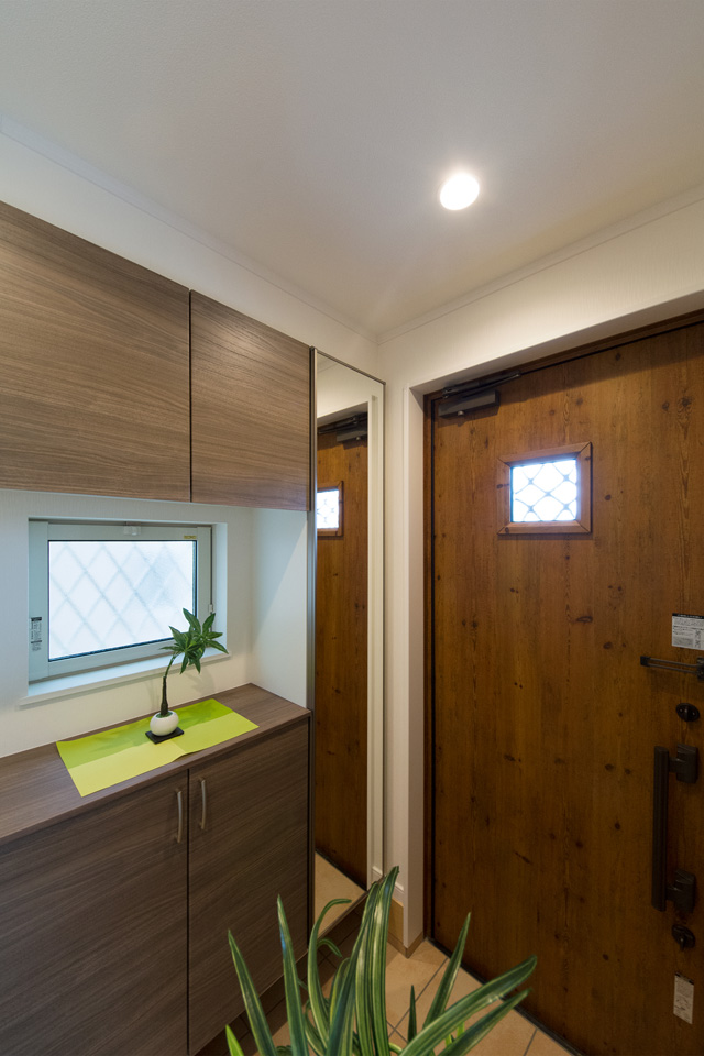ナチュラルな雰囲気を演出するアイリッシュパインの玄関ドア。小窓部分から差し込む光が、明るく開放的ある空間を演出。