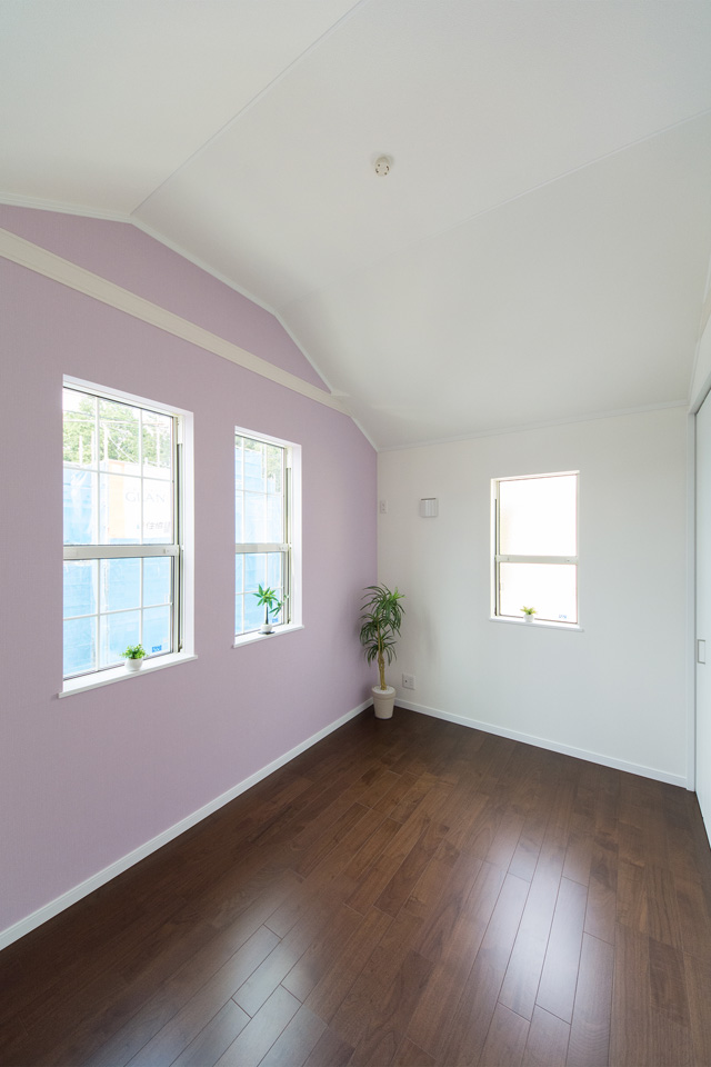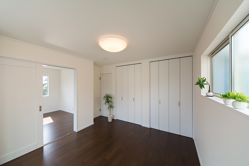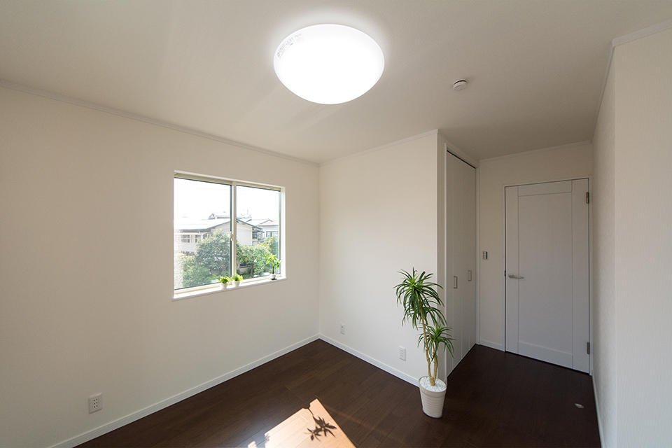 2階洋室。ブラックウォルナットのフローリングと白いクロスがメリハリのある空間を演出。