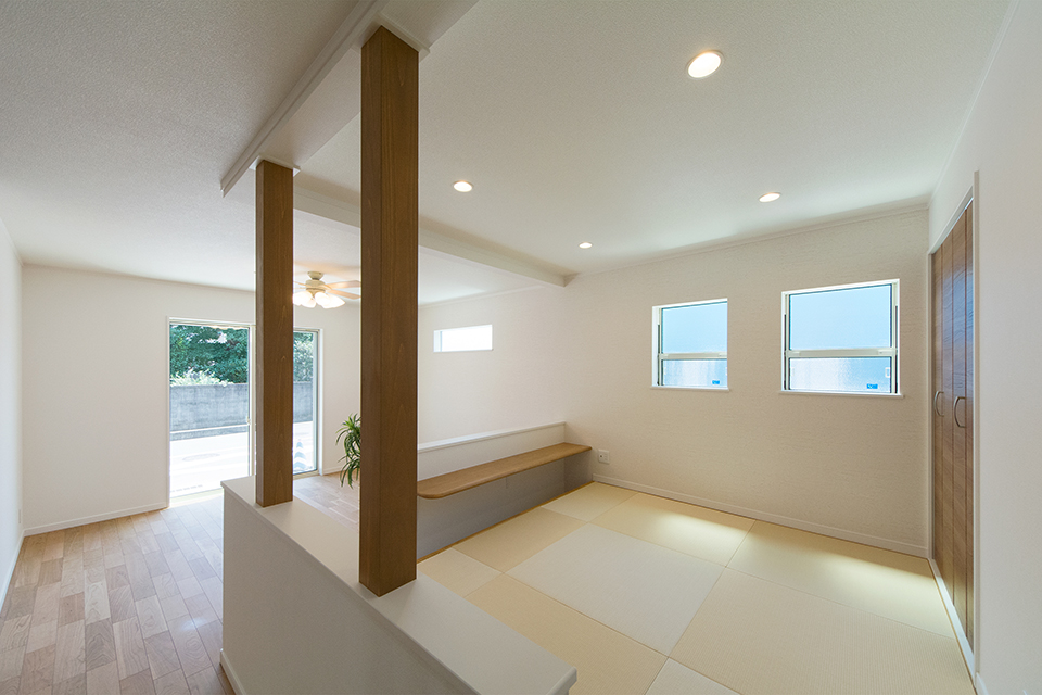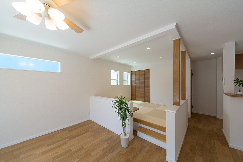 リビングの中心に設えた、小上がり畳敷きスペース。家族みんなが集う癒し空間。